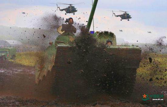 資料圖片:“和平使命-2018”參演中方坦克在空中火力掩護下向預定地域開進。(中國軍網)