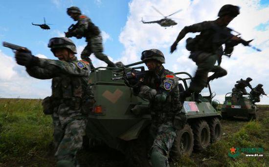 資料圖片:“和平使命-2018”參演中方地面突擊隊快速搶占有利地形。(中國軍網)